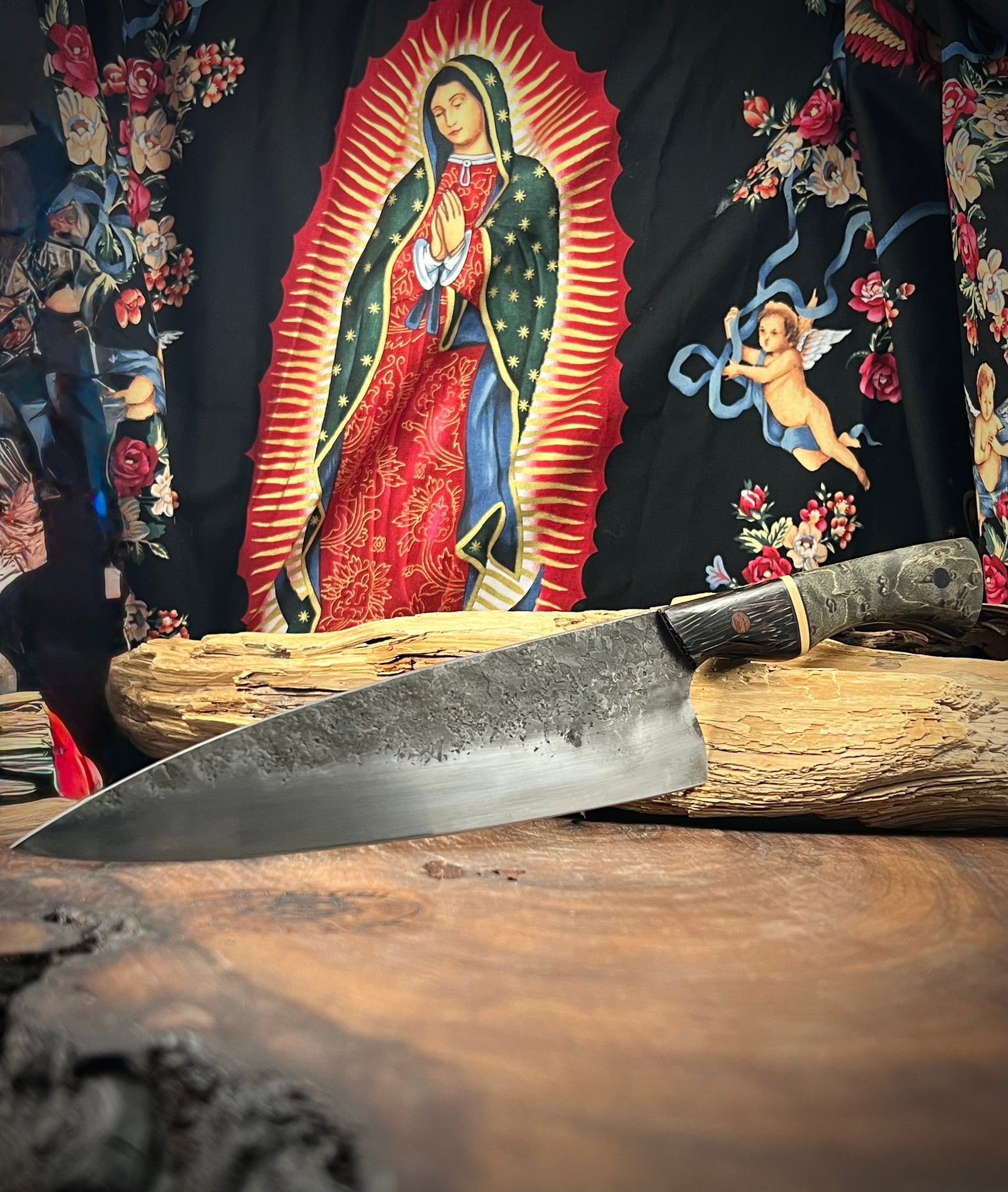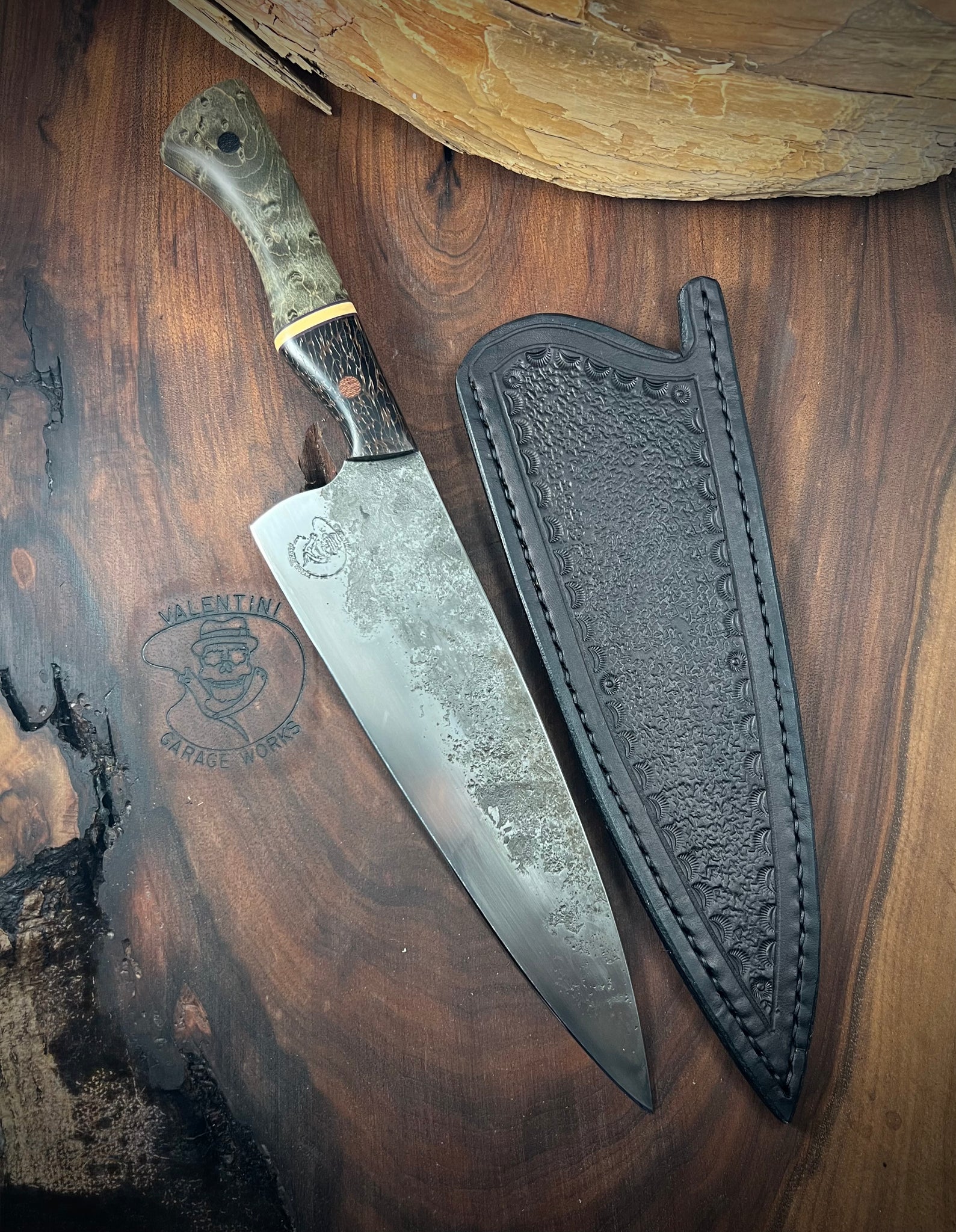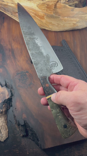 New Chef Knife for the end of September. I have just finished a Brute de Forge Western Chef Knife. This Chef Knife is made from 1095 high carbon steel. This style knife is great for all kitchen duties, it is a very reliable general purpose chef knife. It can process meat fish, vegetables etc. This knife has a cutting edge of 8 1/4 inches (very easy blade length to handle) and a blade height of 2 1/4 inches at the heel which gives medium to larger hands ample clearance from the cutting board. The knife has been heat treated and tempered to approx. 61 on the Rockwell hardness scale. The handle is made of stabilized and dyed Birds Eye Maple with Black Palm Wood at the bolster and it is segmented with Purple G10 and Cream Paper Micarta spacers. Purple G10 liners with Brown and Black micarta pins complete the build. This blade also comes with a hand made leather Saya (sheath).