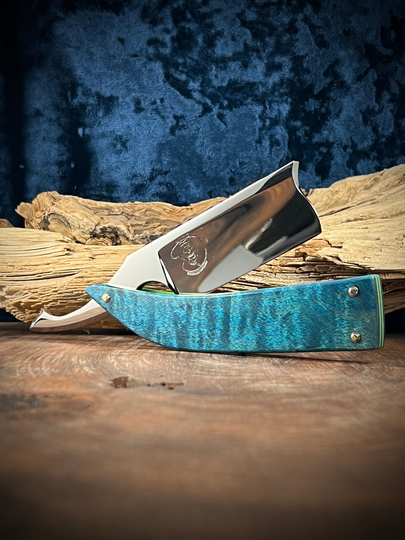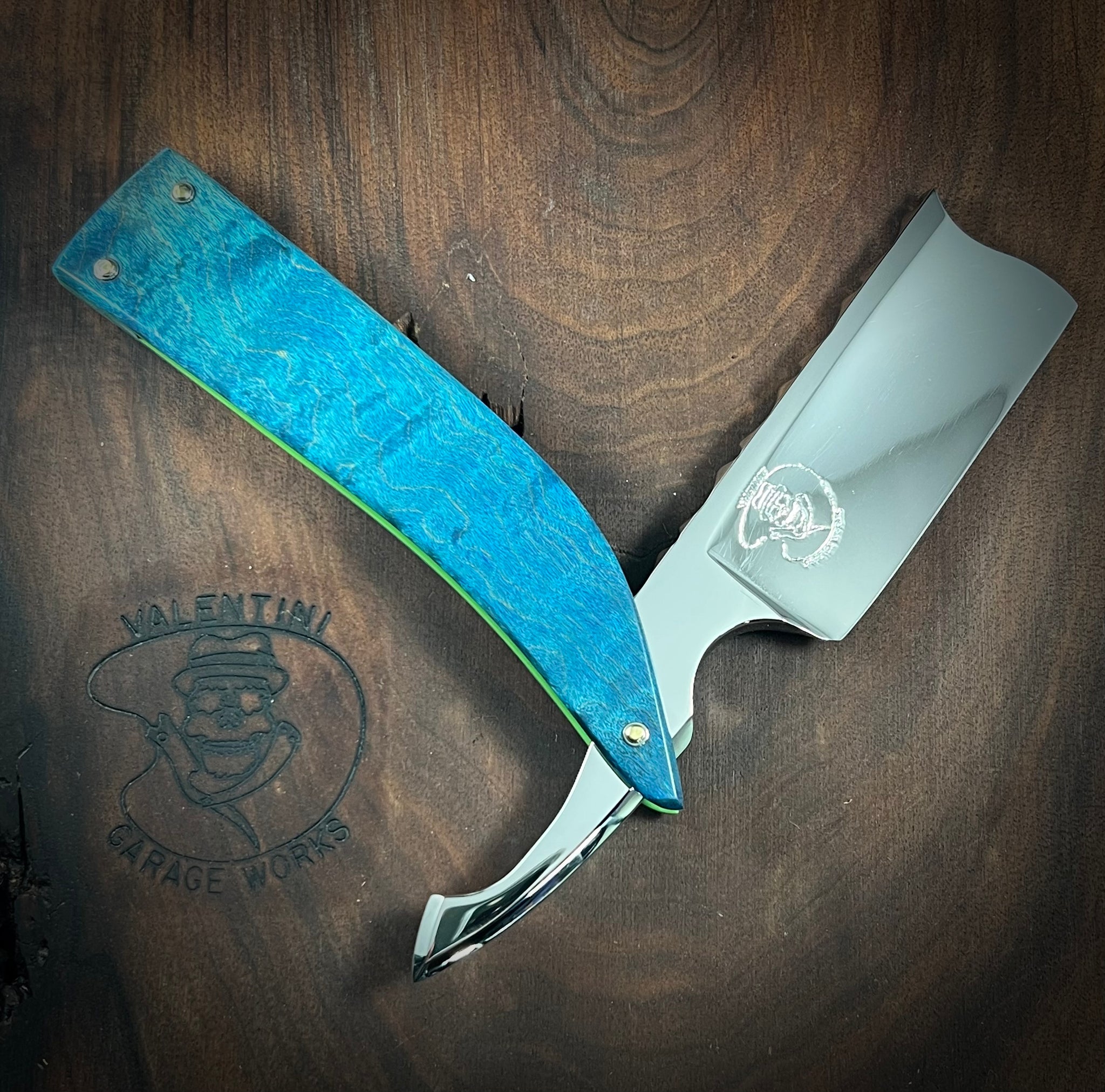 The blade is a quarter hollow grind with an oversized profile. 11/8 at the heel, 11/8 middle and 11/8 at the toe. The spine features a hand filed scalloped pattern. The entire razor was sanded up to 2000 grit and mirror polished (a very time consuming process). The handle is made from stabilized and dyed Hard Curly Maple with Green G10 liners. I made the wedge out of the same Stabilized and dyed Curly Maple. The handles are pinned with Brass pinning rod and stainless steel washers to finish off the build. This razor, as well as all others will be shipped out shave ready. Included with this razor is a leather sheath / case to keep it safe and secure when not in use or when traveling. If you have questions or interest in this or any of my other offerings, please feel free to contact me.